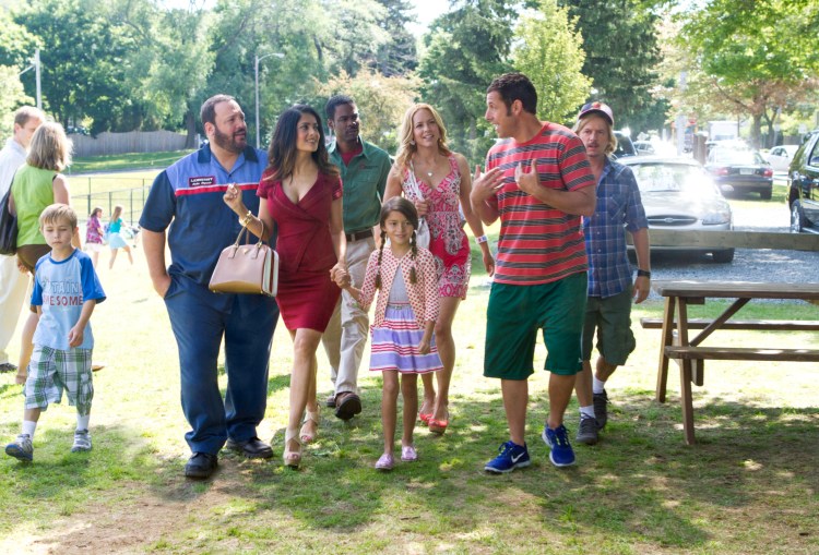 Bean Lamonsoff (Frank/Morgan Gingerich), Eric Lamonsoff (Kevin James), Roxanne Feder (Salma Hayek), Kurt McKenzie (Chris Rock), Becky Feder (Alexys Nycole Sanchez), Sally Lamonsoff (Maria Bello), Lenny Feder (Adam Sandler) and Marcus Higgins (David Spade) walking to the Ice Cream House in Columbia Pictures’ GROWN UPS 2.